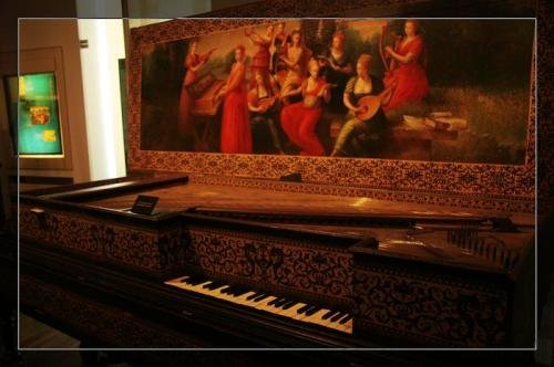 许多展品上方挂着与其相应的大幅油画。画面把演奏式样和风靡一时的生活细节描绘出来,展示了一段段有趣的史实,讲述了一个个鲜活的故事,使人有了理解的起点。在几幅巨型的油画前,现实反倒让人觉得有点虚拟了。